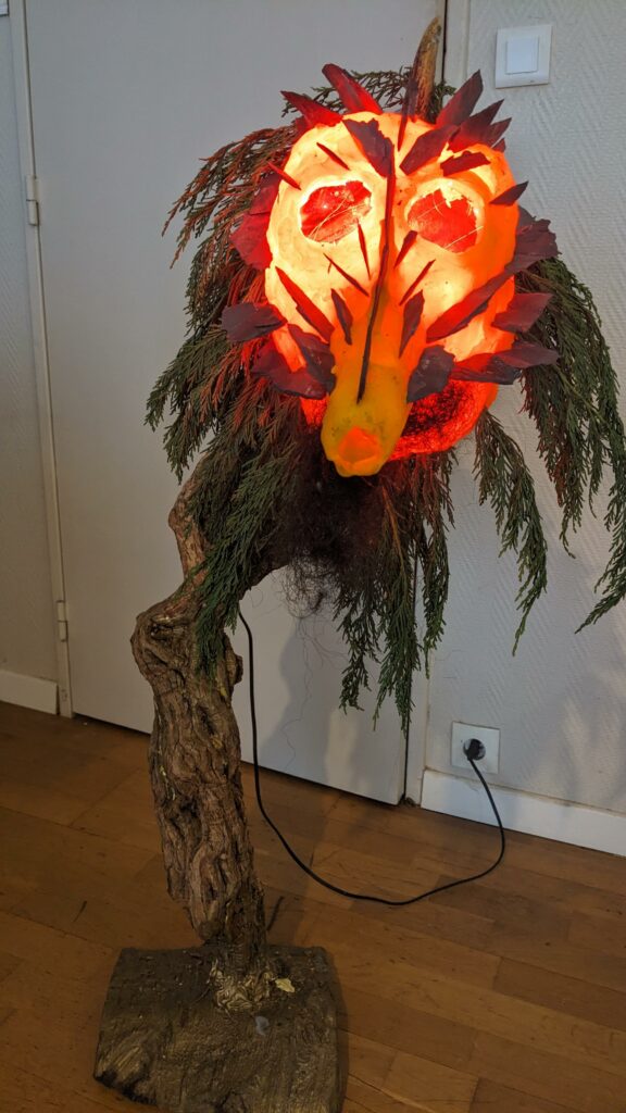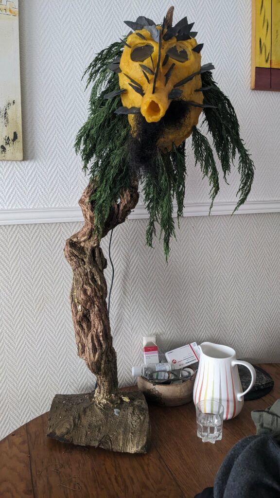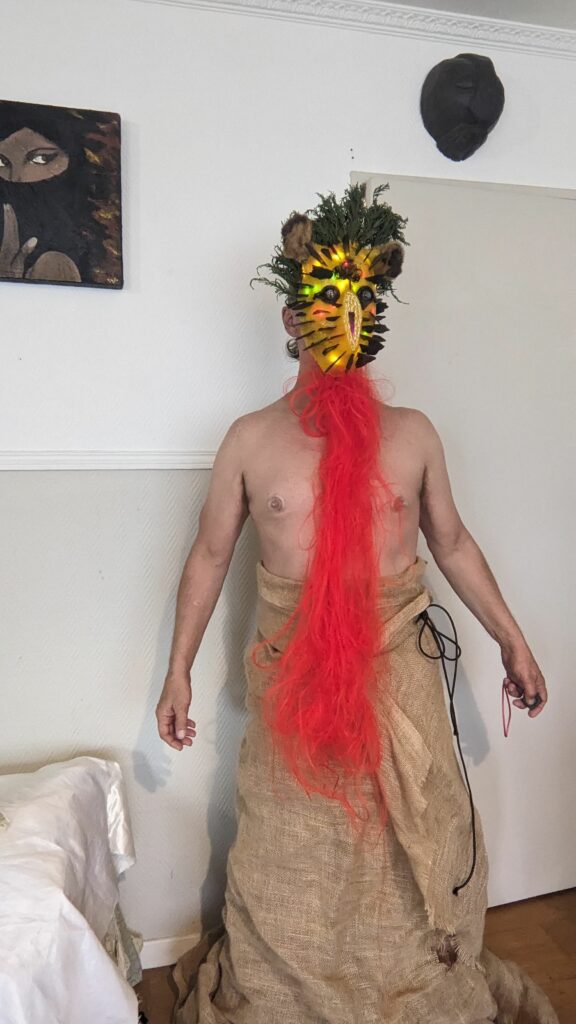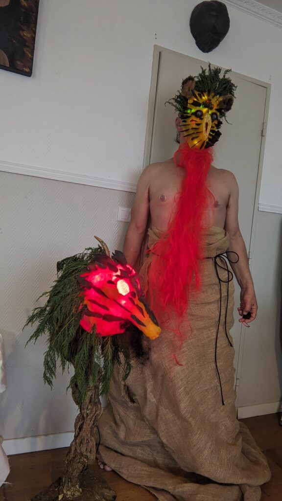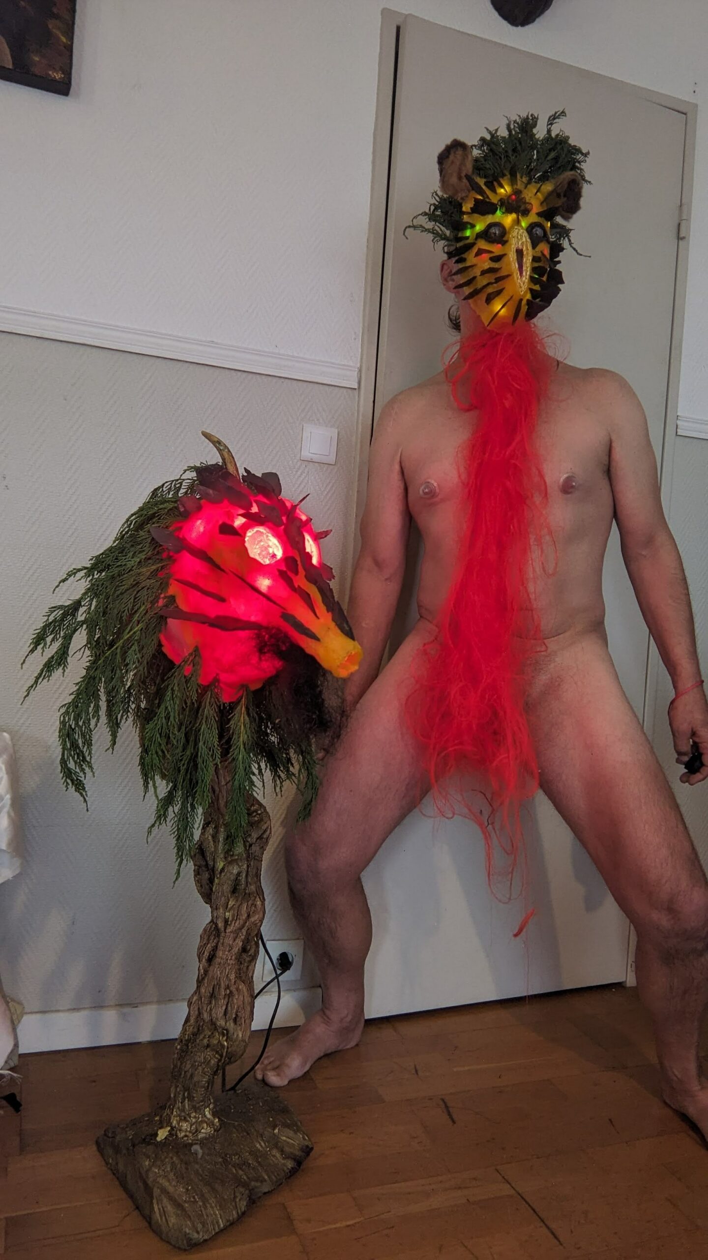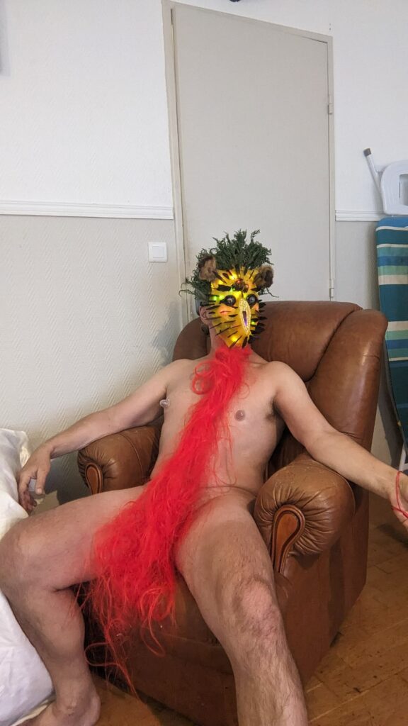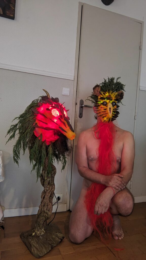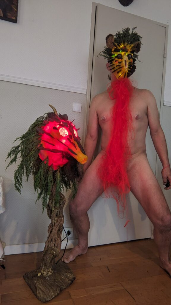 est : lampe himérinale, himérétique (favorise magiquement l’envie bestialeuse de sexe ! c’est ça, oui, oui), fixe-mâle, mobile-femelle, mélangeation de genre (animal, végértal, humain, unique-multiple, hermaaaafrodite), qui vit, qui meurt, dont la bite est baisable, qui peut s’auto-lécher le clito, qui peut faire une cunni-danse, je suis aussi la lampe et porte le masque vulvique, ha, ha, du pornolithique, petite phénoménologie de la temporalité de ma transidentité, puis aussi, contient du dedans qui contemple le dehors où nous sommes, et inversement dans l’autre sens bien sûr, ‘est prodigieux d’abymisationnement…