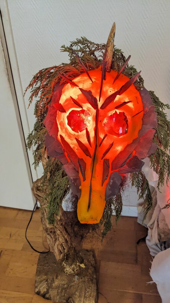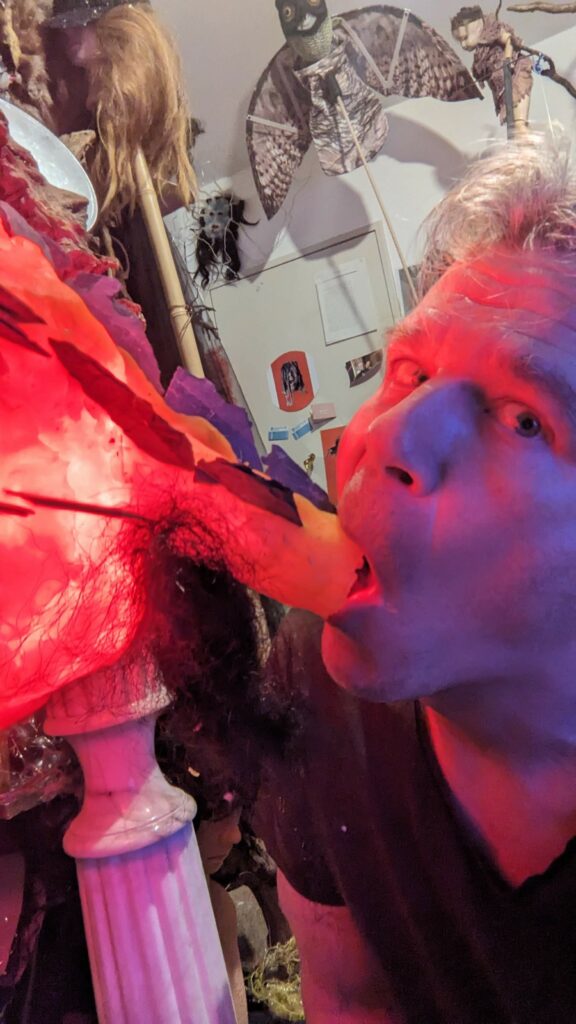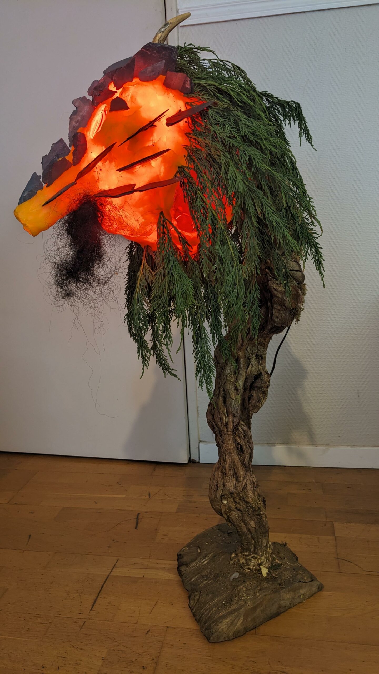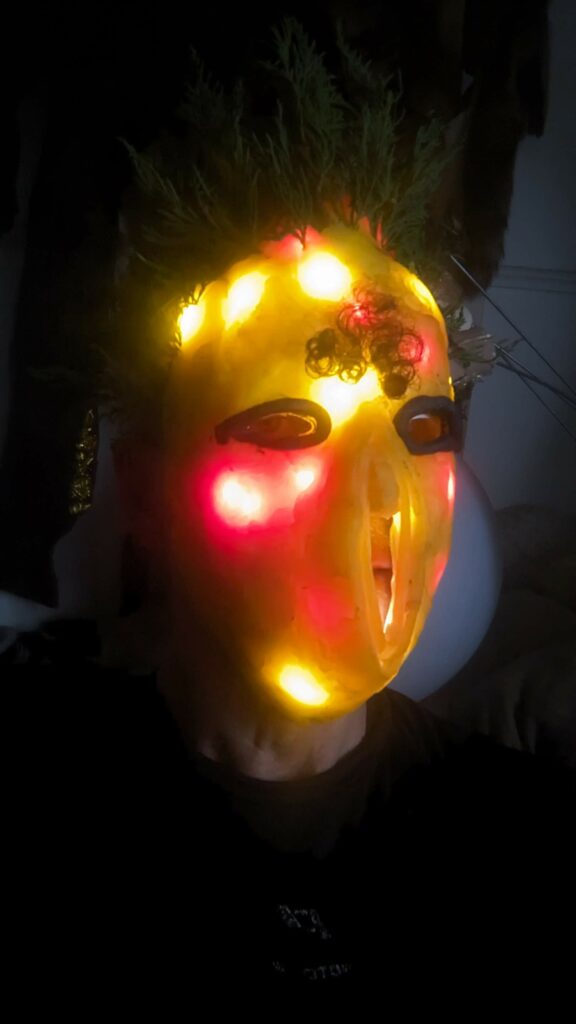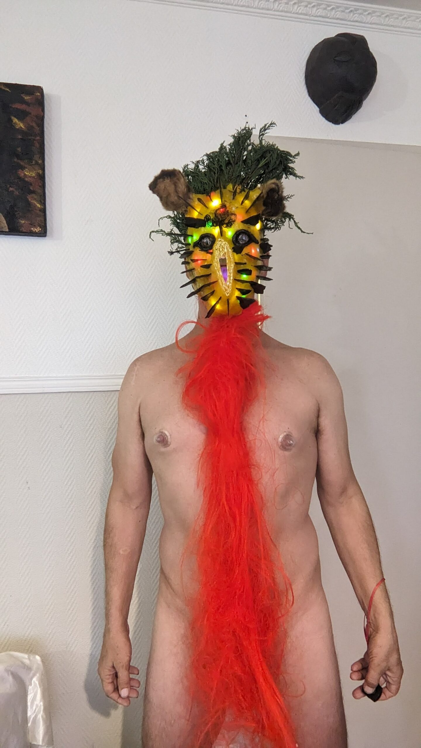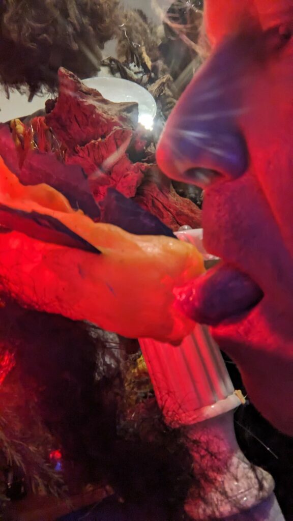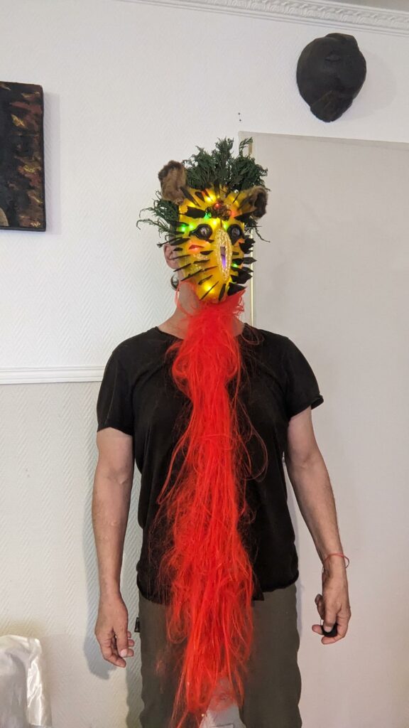 est : lampe himérinale, himérétique (favorise magiquement l’envie bestialeuse de sexe ! c’est ça, oui, oui), fixe-mâle, mobile-femelle, mélangeation de genre (animal, végértal, humain, unique-multiple, hermaaaafrodite), qui vit, qui meurt, dont la bite est baisable, qui peut s’auto-lécher le clito, qui peut faire une cunni-danse, je suis aussi la lampe et porte le masque vulvique, ha, ha, du pornolithique, petite phénoménologie de la temporalité de ma transidentité, puis aussi, contient du dedans qui contemple le dehors où nous sommes, et inversement dans l’autre sens bien sûr, ‘est prodigieux d’abymisationnement…
