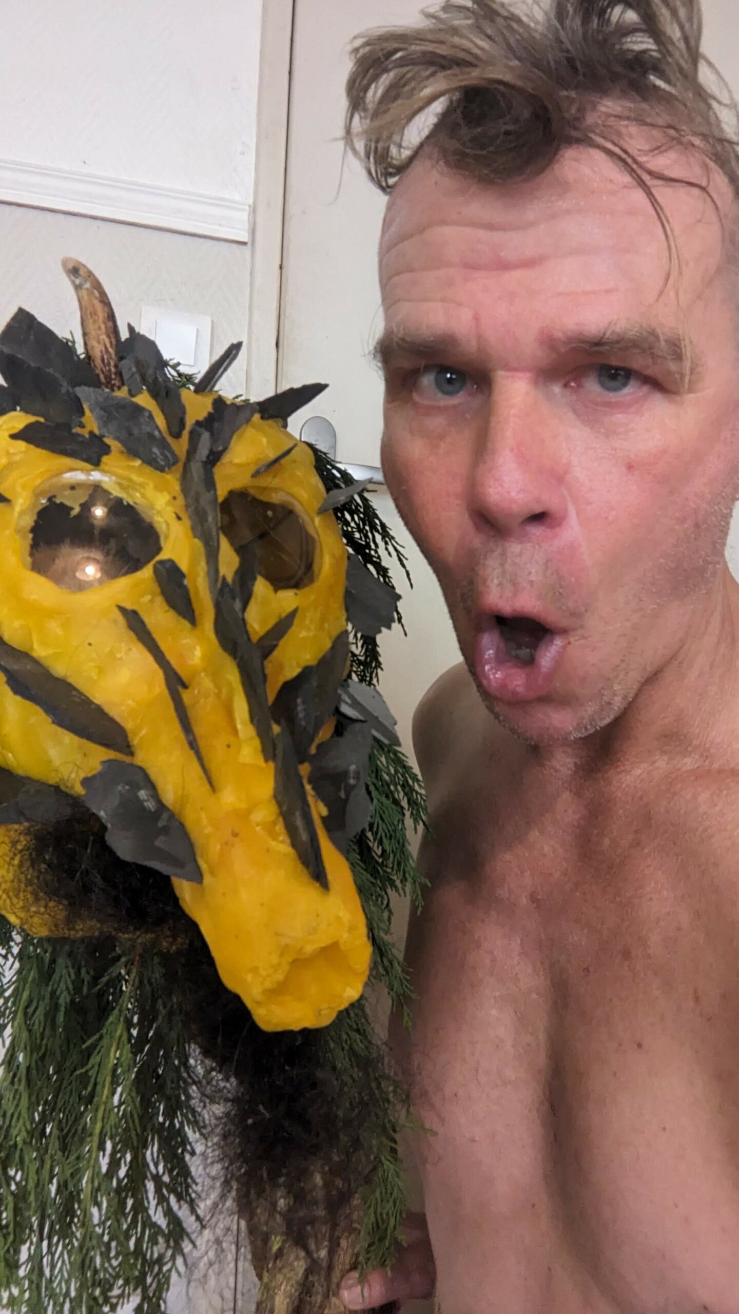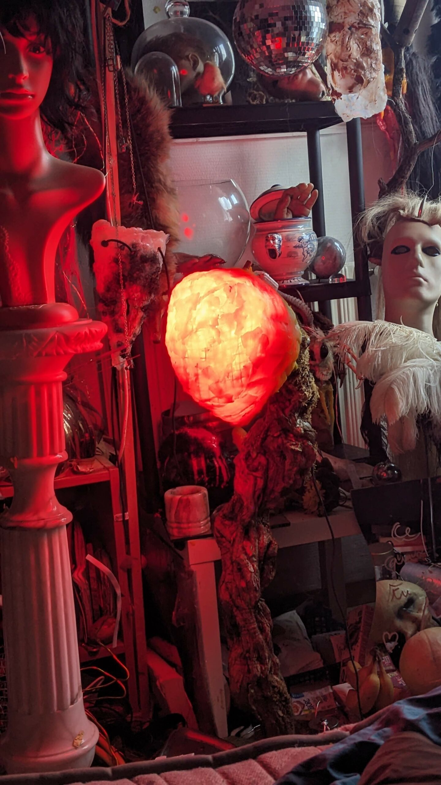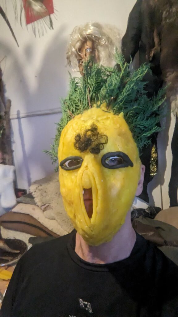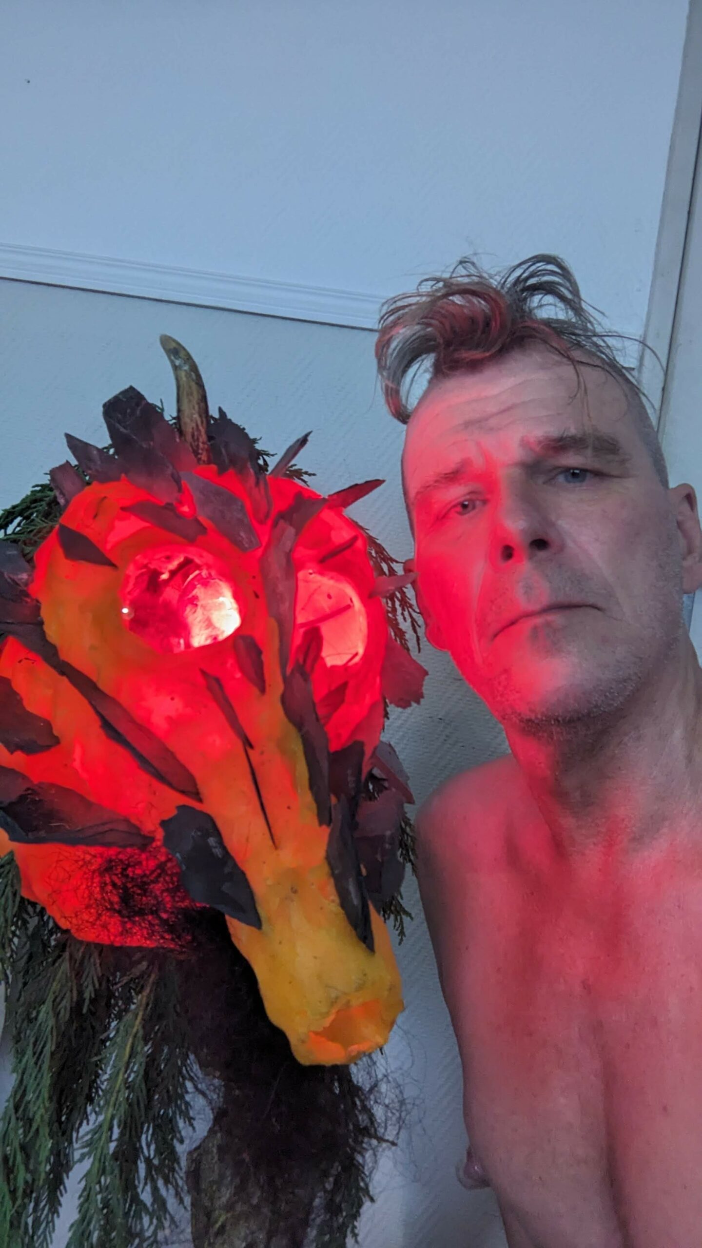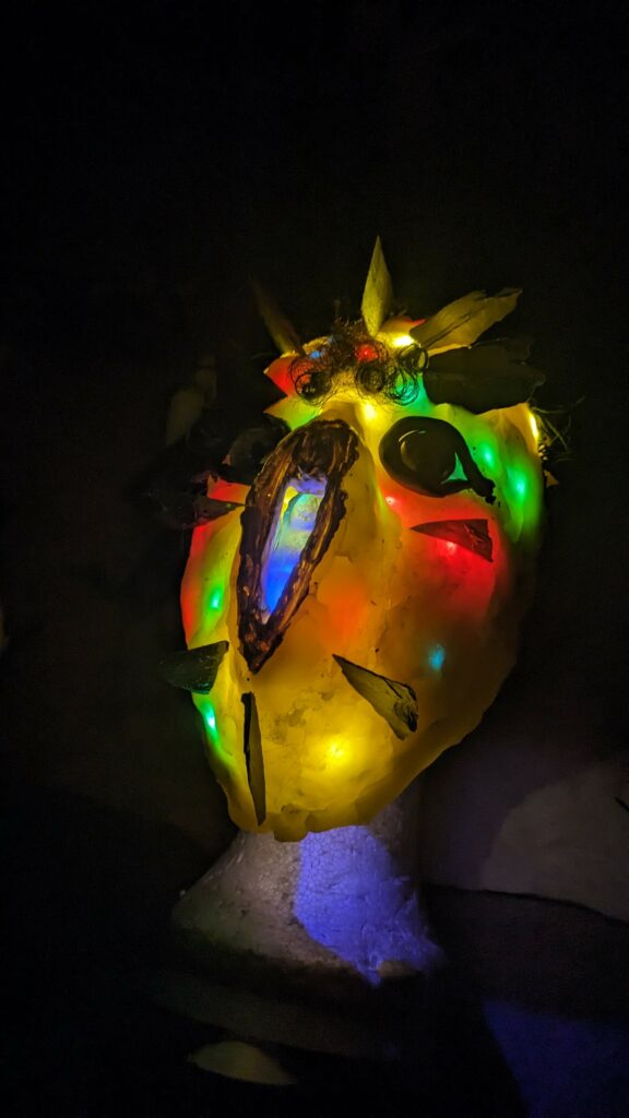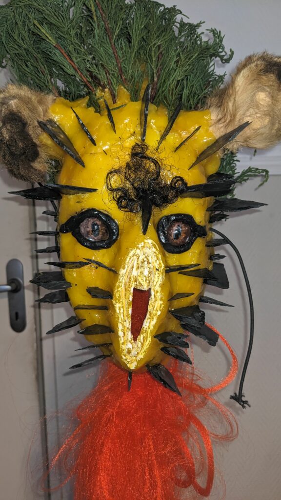 est : lampe himérinale, himérétique (favorise magiquement l’envie bestialeuse de sexe ! c’est ça, oui, oui), fixe-mâle, mobile-femelle, mélangeation de genre (animal, végértal, humain, unique-multiple, hermaaaafrodite), qui vit, qui meurt, dont la bite est baisable, qui peut s’auto-lécher le clito, qui peut faire une cunni-danse, je suis aussi la lampe et porte le masque vulvique, ha, ha, du pornolithique, petite phénoménologie de la temporalité de ma transidentité, puis aussi, contient du dedans qui contemple le dehors où nous sommes, et inversement dans l’autre sens bien sûr, ‘est prodigieux d’abymisationnement…