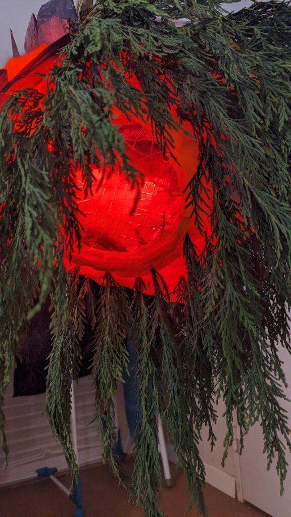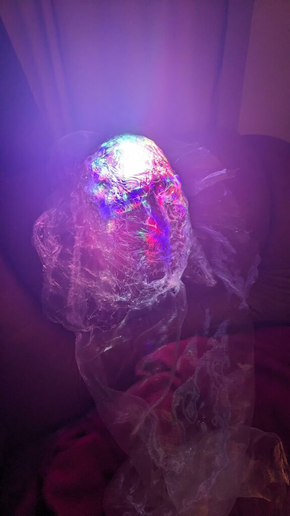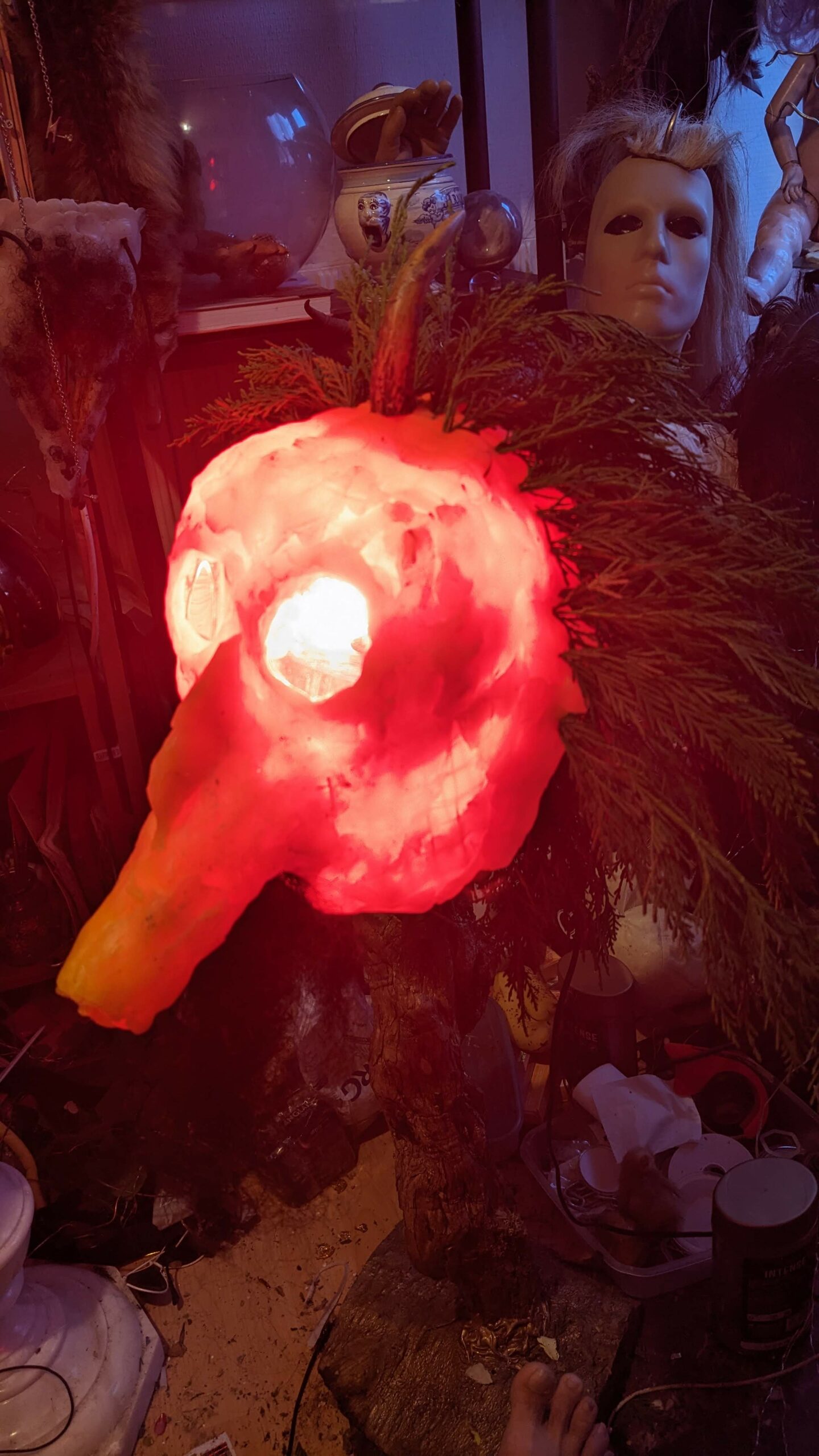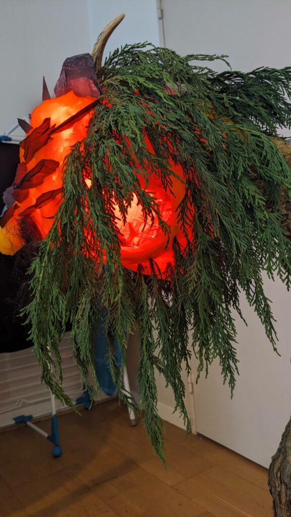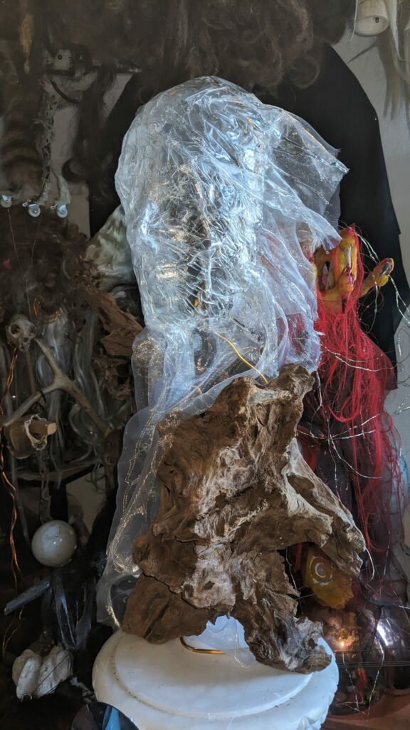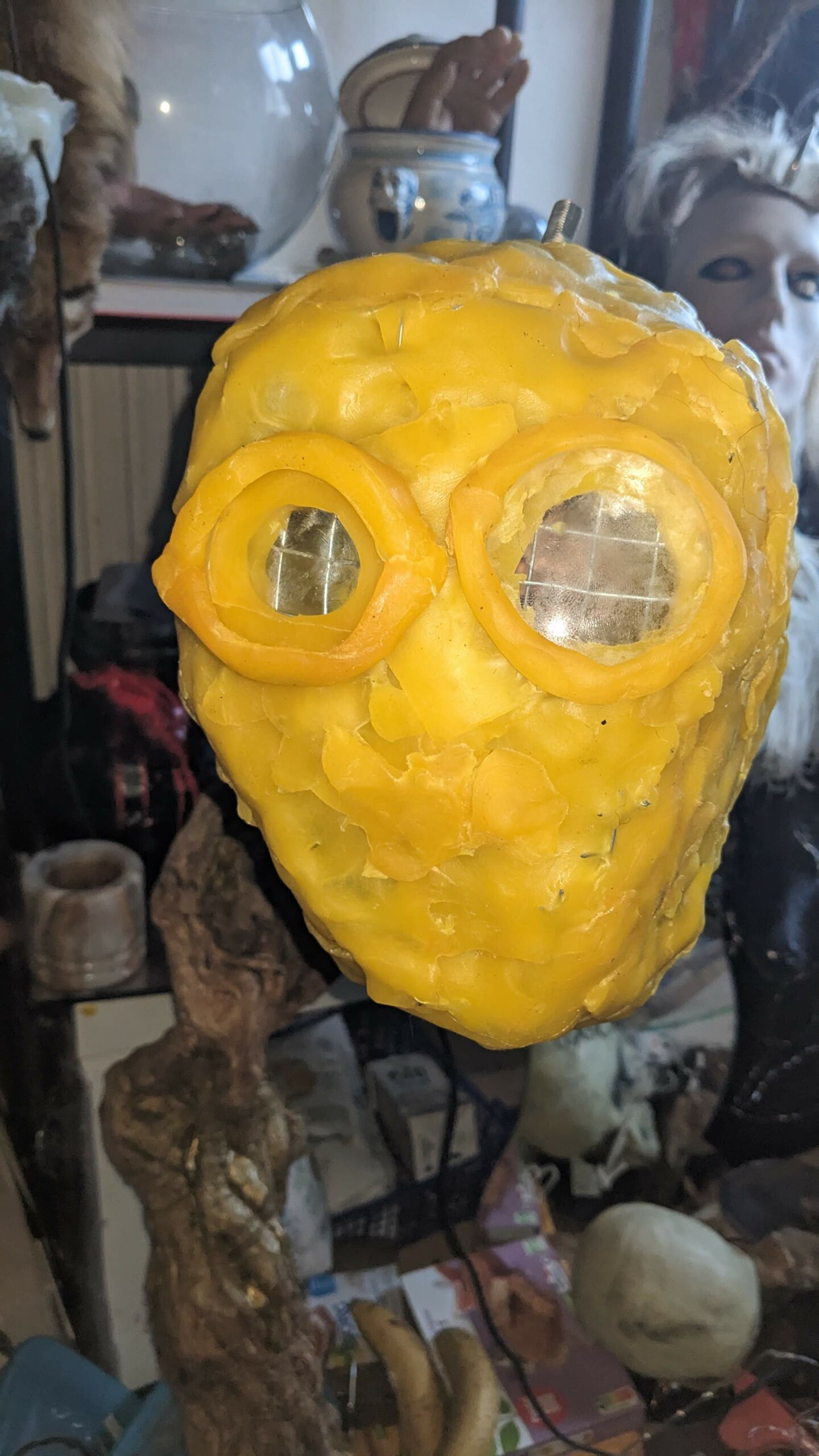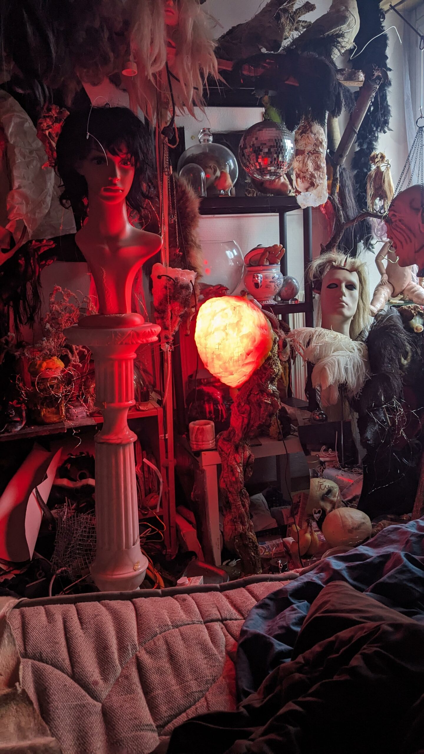 est : lampe himérinale, himérétique (favorise magiquement l’envie bestialeuse de sexe ! c’est ça, oui, oui), fixe-mâle, mobile-femelle, mélangeation de genre (animal, végértal, humain, unique-multiple, hermaaaafrodite), qui vit, qui meurt, dont la bite est baisable, qui peut s’auto-lécher le clito, qui peut faire une cunni-danse, je suis aussi la lampe et porte le masque vulvique, ha, ha, du pornolithique, petite phénoménologie de la temporalité de ma transidentité, puis aussi, contient du dedans qui contemple le dehors où nous sommes, et inversement dans l’autre sens bien sûr, ‘est prodigieux d’abymisationnement…